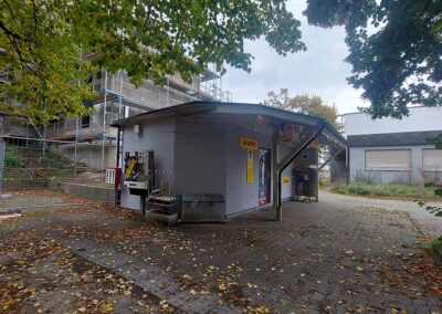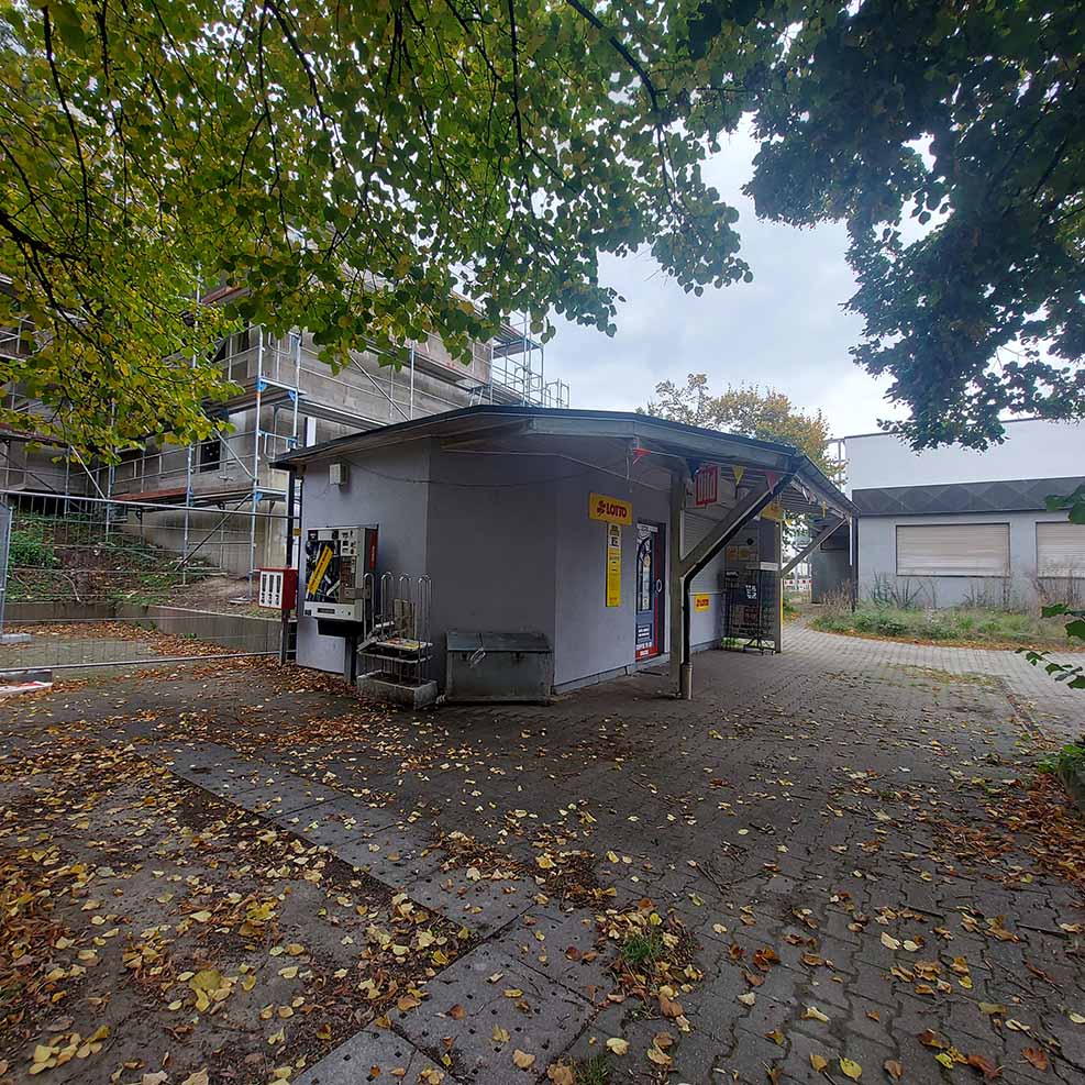 Im Stadtteilzentrum leere Schaufenster, geschlossene Läden; Treppen, von denen der Beton abplatzt, Schlingpflanzen und Bodendecker überwuchern Sand, Kies und Mutterboden zwischen den Gebäuden am zentralen Platz. Dort steht einsam und verlassen ein ehemaliger Kiosk.